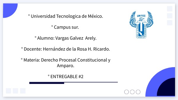 ° Universidad Tecnologica de México. ° Campus sur. ° Alumno: Vargas Galvez Arely. ° Docente: Hernández de la Rosa H. Ricardo. ° Materia: Derecho Procesal Constitucional y Amparo. ° ENTREGABLE #2