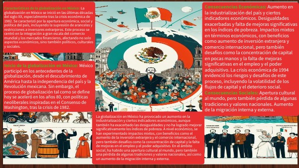 Características de la globalización en México: La globalización en México se inició en las últimas décadas del siglo XX, especialmente tras la crisis económica de 1982. Se caracterizó por la apertura económica, social y política del país, incluyendo la supresión de aranceles y restricciones a inversores extranjeros. Este proceso se centró en la integración a gran escala del comercio mundial y los mercados financieros, afectando no solo aspectos económicos, sino también políticos, culturales y sociales.