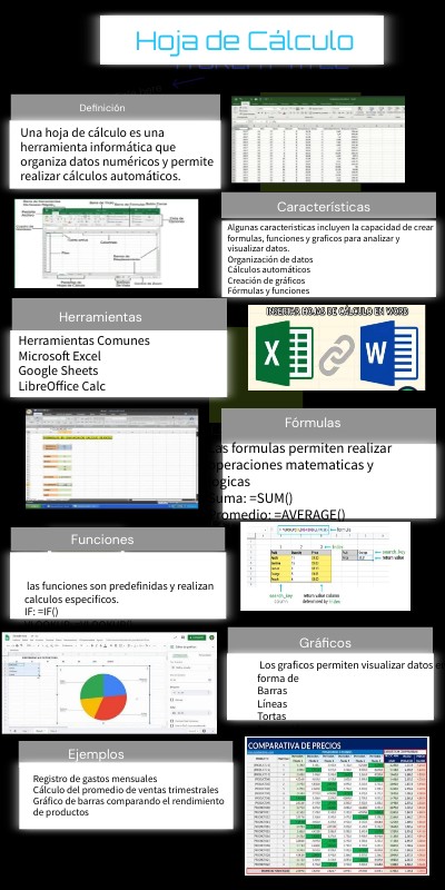 INFOGRAFÍA HOJA DE CÁLCULO (DEFINICIÓN, CARACTERÍSTICAS, HERRAMIENTAS, FÓRMULAS, FUNCIONES, GRÁFICOS, EJEMPLOS