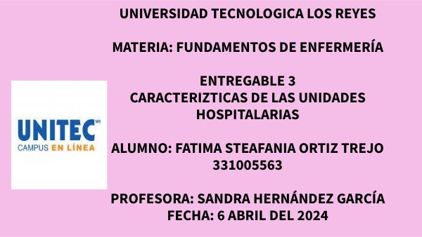 UNIVERSIDAD TECNOLOGICA LOS REYES MATERIA: FUNDAMENTOS DE ENFERMERÍA ENTREGABLE 3 CARACTERIZTICAS DE LAS UNIDADES HOSPITALARIAS ALUMNO: FATIMA STEAFANIA ORTIZ TREJO 331005563 PROFESORA: SANDRA HERNÁNDEZ GARCÍA FECHA: 6 ABRIL DEL 2024