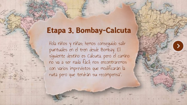 Hola niños y niñas; hemos conseguido salir puntuales en el tren desde Bombay. El siguiente destino es Calcuta, pero el camino no va a ser nada fácil; nos encontraremos con varios imprevistos que modificarán la ruta pero que tendrán su recompensa”.