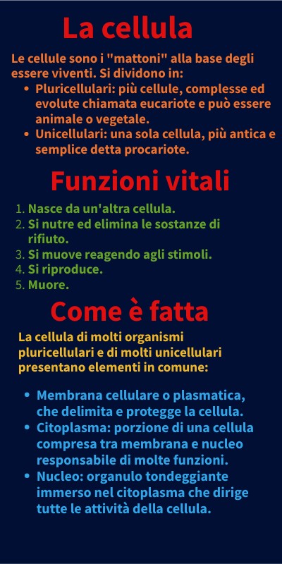 Le cellule sono i "mattoni" alla base degli essere viventi. Si dividono in:- Pluricellulari: più cellule, complesse ed evolute chiamata eucariote e può essere animale o vegetale.