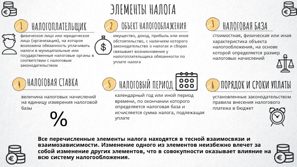 Все перечисленные элементы налога находятся в тесной взаимосвязи и взаимозависимости. Изменение одного из элементов неизбежно влечет за собой изменение других элементов, что в совокупности оказывает влияние на всю систему налогообложения.