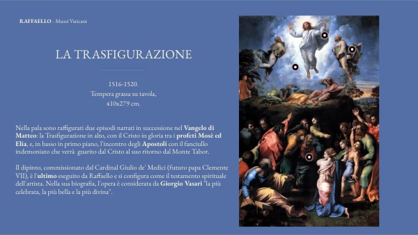 Nella pala sono raffigurati due episodi narrati in successione nel Vangelo di Matteo: la Trasfigurazione in alto, con il Cristo in gloria tra i profeti Mosè ed Elia, e, in basso in primo piano, l'incontro degli Apostoli con il fanciullo indemoniato che verrà guarito dal Cristo al suo ritorno dal Monte Tabor. Il dipinto, commissionato dal Cardinal Giulio de' Medici (futuro papa Clemente VII), è l'ultimo eseguito da Raffaello e si configura come il testamento spirituale dell'artista. Nella sua biografia, l'opera è considerata da Giorgio Vasari "la più celebrata, la più bella e la più divina".