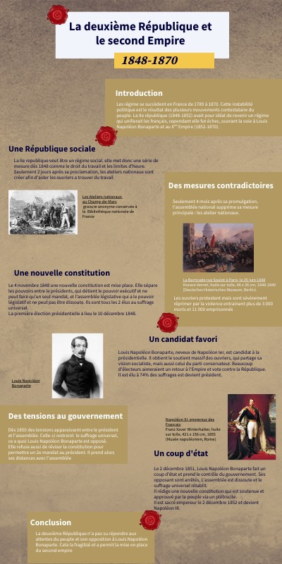 Les régime se succèdent en France de 1789 à 1870. Cette instabilité politique est le résultat des plusieurs mouvements contestataire du peuple. La IIe république (1848-1852) avait pour idéal de revenir un régime qui unifierait les français, cependant elle fut échec, ouvrant la voie à Louis Napoléon Bonaparte et au IInd Empire (1852-1870).