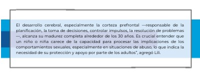 El desarrollo cerebral, especialmente la corteza prefrontal —responsable de la planificación, la toma de decisiones, controlar impulsos, la resolución de problemas—, alcanza su madurez completa alrededor de los 30 años. Es crucial entender que un niño o niña carece de la capacidad para procesar las implicaciones de los comportamientos sexuales, especialmente en situaciones de abuso, lo que indica la necesidad de su protección y apoyo por parte de los adultos”, agregó Lili.