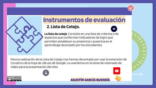 Para la realización de la Lista de Cotejo nos hemos decantado por usar la extensión de Corubrics de la hoja de cálculo de Google. La usaríamos en la tarea de visionado de vídeo para la presentación del reto.