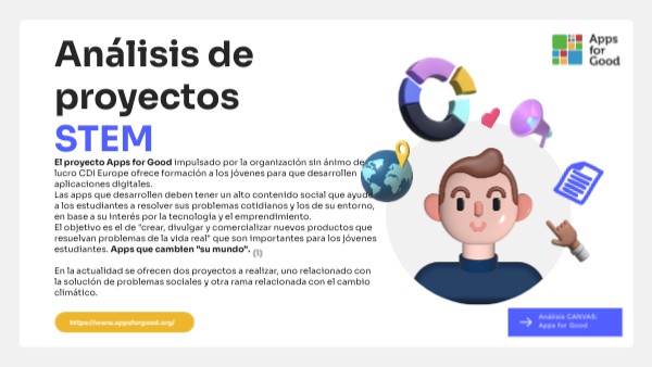 El proyecto Apps for Good impulsado por la organización sin ánimo de lucro CDI Europe ofrece formación a los jóvenes para que desarrollen aplicaciones digitales. Las apps que desarrollen deben tener un alto contenido social que ayude a los estudiantes a resolver sus problemas cotidianos y los de su entorno, en base a su interés por la tecnología y el emprendimiento. El objetivo es el de "crear, divulgar y comercializar nuevos productos que resuelvan problemas de la vida real" que son importantes para los jóvenes estudiantes. Apps que cambien "su mundo". En la actualidad se ofrecen dos proyectos a realizar, uno relacionado con la solución de problemas sociales y otra rama relacionada con el cambio climático.