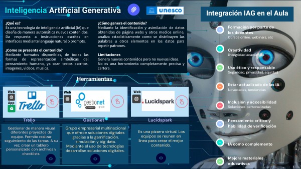 La IAG ofrece diversas herramientas de apoyo al docente para enriquecer el material didáctico como innovar en sus metodos de enseñanza.