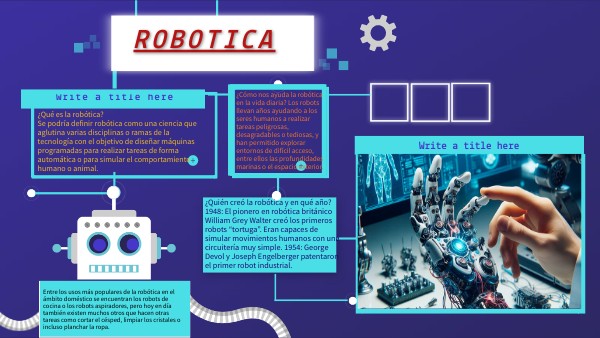 ¿Quién creó la robótica y en qué año? 1948: El pionero en robótica británico William Grey Walter creó los primeros robots “tortuga”. Eran capaces de simular movimientos humanos con una circuitería muy simple. 1954: George Devol y Joseph Engelberger patentaron el primer robot industrial.