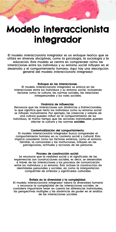 Enfoque en las interacciones: El modelo interaccionista integrador se enfoca en las interacciones entre los individuos y su entorno social, incluyendo factores como la cultura, las normas sociales, las relaciones interpersonales y los roles sociales. Dinámica de influencias: Reconoce que las interacciones son dinámicas y bidireccionales, lo que significa que tanto los individuos como su entorno social se influyen mutuamente. Por ejemplo, las creencias y valores de una cultura pueden influir en el comportamiento de los individuos, al mismo tiempo que las acciones individuales pueden afectar la cultura y las normas sociales. Contextualización del comportamiento: El modelo interaccionista integrador busca comprender el comportamiento humano en su contexto social y cultural. Esto implica considerar cómo los factores externos, como el entorno familiar, la comunidad y las instituciones, influyen en las percepciones, actitudes y acciones de las personas. Proceso de construcción social: Se reconoce que la realidad social y el significado de las experiencias son construcciones sociales, es decir, se desarrollan a través de las interacciones y los procesos de comunicación entre los individuos y su entorno. Esto incluye la construcción de identidades personales y sociales, así como la interpretación compartida de símbolos y significados culturales. Énfasis en la diversidad y la complejidad: El modelo interaccionista integrador valora la diversidad humana y reconoce la complejidad de las interacciones sociales. Se considera importante tener en cuenta las diferencias individuales, las perspectivas múltiples y las dinámicas de poder en el análisis de las interacciones sociales.