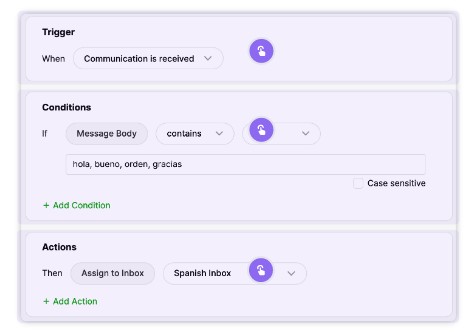 Because our Condition is met, Action is taken by routing the conversation to the Spanish Inbox. So by design, our rule controls routing when messages of this nature are received.