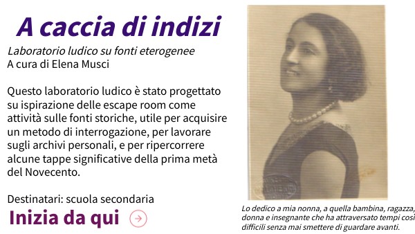 Laboratorio ludico su fonti eterogenee A cura di Elena Musci Questo laboratorio ludico è stato progettato su ispirazione delle escape room come attività sulle fonti storiche, utile per acquisire un metodo di interrogazione, per lavorare sugli archivi personali, e per ripercorrere alcune tappe significative della prima metà del Novecento. Destinatari: scuola secondaria