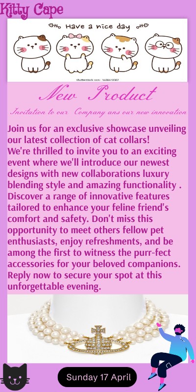 Join us for an exclusive showcase unveiling our latest collection of cat collars! We're thrilled to invite you to an exciting event where we'll introduce our newest designs with new collaborations luxury blending style and amazing functionality . Discover a range of innovative features tailored to enhance your feline friend's comfort and safety. Don't miss this opportunity to meet others fellow pet enthusiasts, enjoy refreshments, and be among the first to witness the purr-fect accessories for your beloved companions. Reply now to secure your spot at this unforgettable evening.
