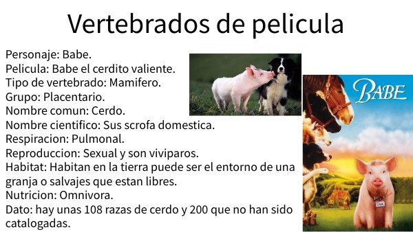 Personaje: Babe.Pelicula: Babe el cerdito valiente. Tipo de vertebrado: Mamifero. Grupo: Placentario. Nombre comun: Cerdo. Nombre cientifico: Sus scrofa domestica. Respiracion: Pulmonal. Reproduccion: Sexual y son viviparos. Habitat: Habitan en la tierra puede ser el entorno de una granja o salvajes que estan libres. Nutricion: Omnivora. Dato: hay unas 108 razas de cerdo y 200 que no han sido catalogadas.
