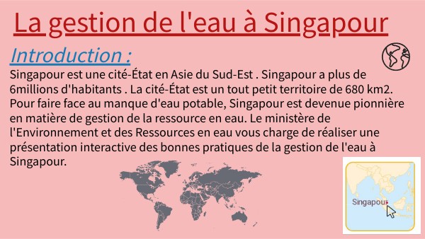 Singapour est une cité-État en Asie du Sud-Est . Singapour a plus de 6millions d'habitants . La cité-État est un tout petit territoire de 680 km2. Pour faire face au manque d'eau potable, Singapour est devenue pionnière en matière de gestion de la ressource en eau. Le ministère de l'Environnement et des Ressources en eau vous charge de réaliser une présentation interactive des bonnes pratiques de la gestion de l'eau à Singapour.