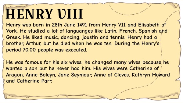 Henry was born in 28th June 1491 from Henry VII and Elisabeth of York. He studied a lot of languanges like Latin, French, Spanish and Greek. He liked music, dancing, joustin and tennis. Henry had a brother, Arthur, but he died when he was ten. During the Henry's period 70,00 people was executed. He was famous for his six wives: he changed many wives because he wanted a son but he never had him. His wives were Catherine of Aragon, Anne Boleyn, Jane Seymour, Anne of Cleves, Kathryn Howard and Catherine Parr.