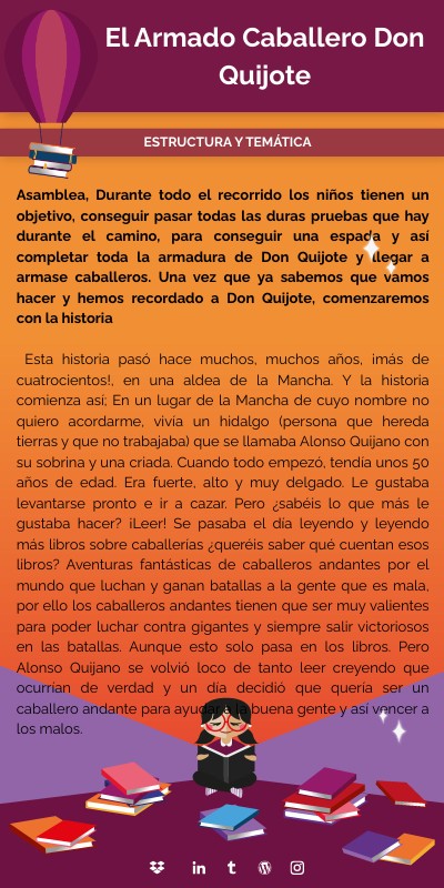 Asamblea, Durante todo el recorrido los niños tienen un objetivo, conseguir pasar todas las duras pruebas que hay durante el camino, para conseguir una espada y así completar toda la armadura de Don Quijote y llegar a armase caballeros. Una vez que ya sabemos que vamos hacer y hemos recordado a Don Quijote, comenzaremos con la historia Esta historia pasó hace muchos, muchos años, ¡más de cuatrocientos!, en una aldea de la Mancha. Y la historia comienza así; En un lugar de la Mancha de cuyo nombre no quiero acordarme, vivía un hidalgo (persona que hereda tierras y que no trabajaba) que se llamaba Alonso Quijano con su sobrina y una criada. Cuando todo empezó, tendía unos 50 años de edad. Era fuerte, alto y muy delgado. Le gustaba levantarse pronto e ir a cazar. Pero ¿sabéis lo que más le gustaba hacer? ¡Leer! Se pasaba el día leyendo y leyendo más libros sobre caballerías ¿queréis saber qué cuentan esos libros? Aventuras fantásticas de caballeros andantes por el mundo que luchan y ganan batallas a la gente que es mala, por ello los caballeros andantes tienen que ser muy valientes para poder luchar contra gigantes y siempre salir victoriosos en las batallas. Aunque esto solo pasa en los libros. Pero Alonso Quijano se volvió loco de tanto leer creyendo que ocurrían de verdad y un día decidió que quería ser un caballero andante para ayudar a la buena gente y así vencer a los malos.