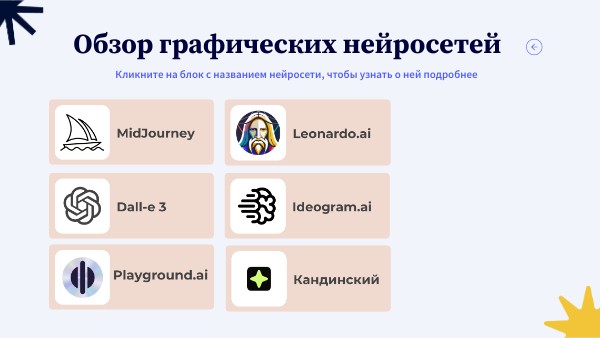 Кликните на блок с названием нейросети, чтобы узнать о ней подробнее