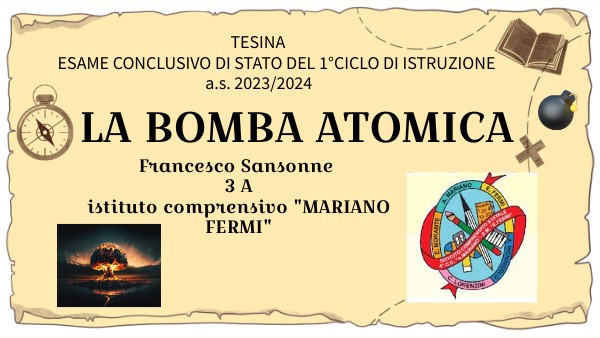Tra i tanti argomenti proposti per la tesina ha subito attirato la mia attenzione: LA BOMBA ATOMICA. Io avevo scelto la seconda guerra mondiale, ma quando ho visto scritto sugli argomenti "BOMBA ATOMICA", ho capito che era proprio questo l' argomento del primo esame della mia vita. Mi piace questo argomento perchè sono appassionato di storia, soprattutto di circa 100 anni fa, delle guerre, rivoluzioni e el passato, per non commettere gli stessi errori o per essere fieri di quello che si è fatto, per costruire nuove cose. La bomba atomica è un esempio di distruzione ed errore commeso dagli Stati Uniti, potevano risolvere la questione in modo diplomatico, ma hanno scelto la soluzione peggiore, uccidendo milioni di persone innocenti.