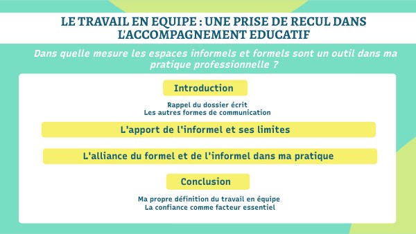 - Les temps informels font partie intégrante du travail de l'éducateur spécialisé = de prendre du recul sur les situations, transmettre et confronter ses analyses, avoir un retour sur ses pratiques professionnelles.