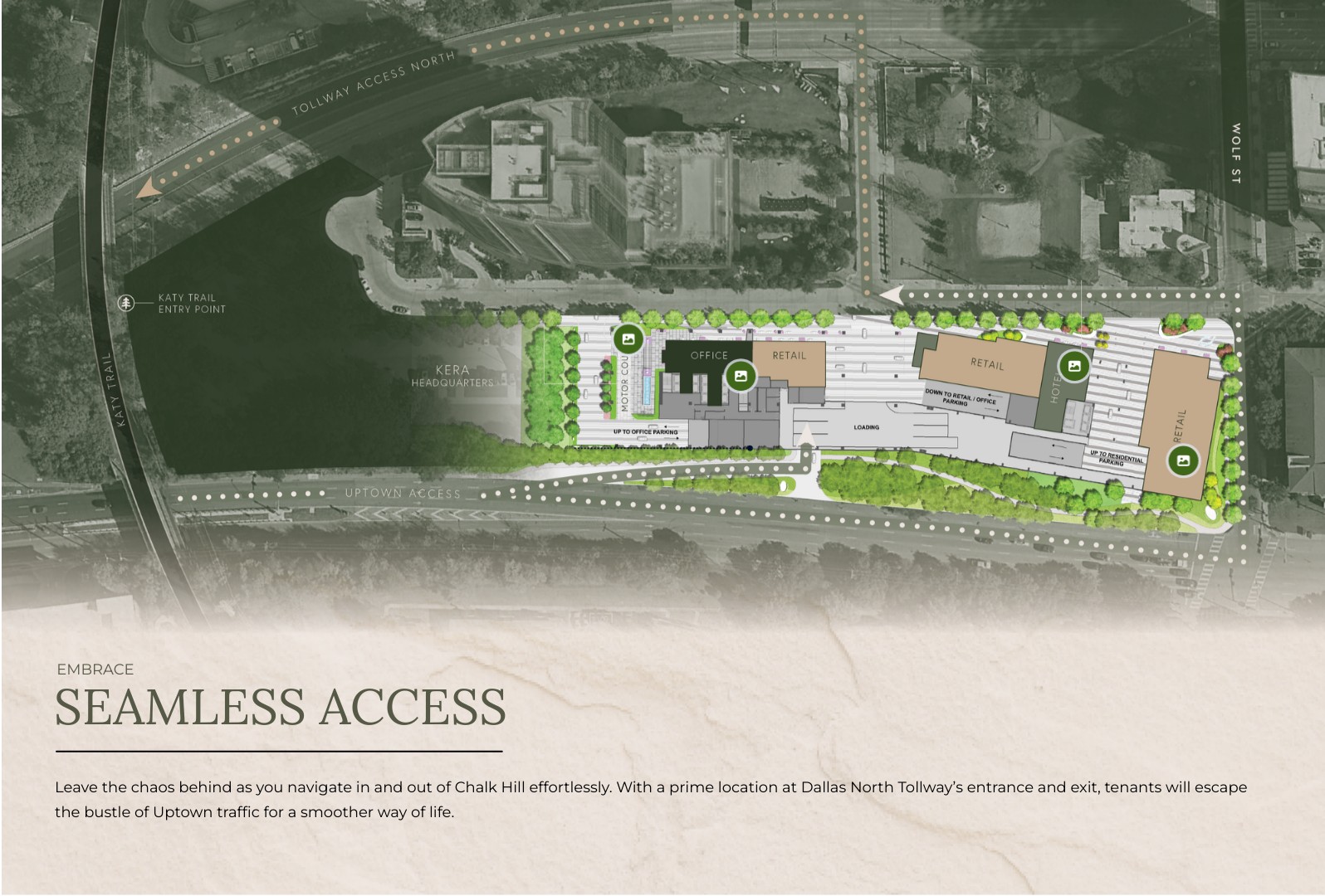 Leave the chaos behind as you navigate in and out of Chalk Hill effortlessly. With a prime location at Dallas North Tollway’s entrance and exit, tenants will escape the bustle of Uptown traffic for a smoother way of life.