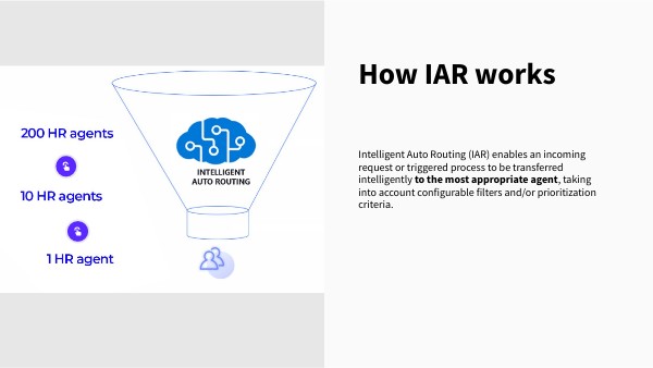 Intelligent Auto Routing (IAR) enables an incoming request or triggered process to be transferred intelligently to the most appropriate agent, taking into account configurable filters and/or prioritization criteria.