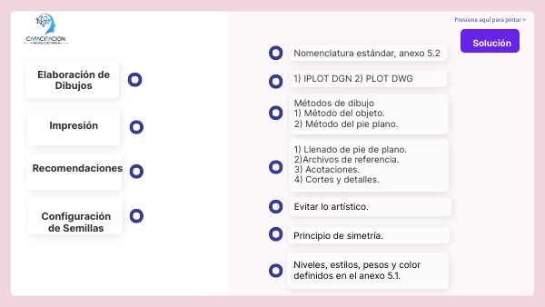 1) Llenado de pie de plano.2) Archivos de referencia.3) Acotaciones.4) Cortes y detalles.