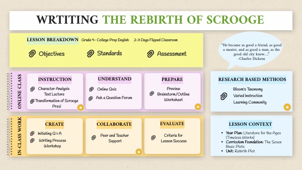 Students will be assessed both formatively and summatively throughout the first two writing workshop days. The ability to summarize Scrooge ’s transformation and to recognize steps of character analysis will be assessed formatively through the online Schoology quiz prior to classtime. Student success with planning and organizing the analysis of the impact of a phase ofScrooge ’s life will be assessed using the in-class worksheet and teacher-student writing conferences during the workshop. Students ability to use class time for productive and collaborative writing work will be observed during class time.