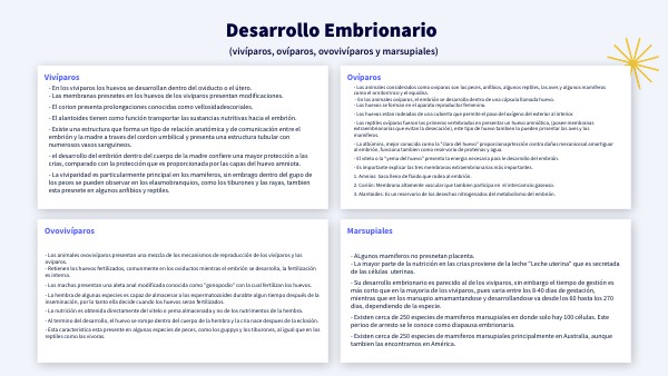 - En los viviparos los huevos se desarrollan dentro del oviducto o el útero. - Las membranas presnetes en los huevos de los viviparos presentan modificaciones. - El corion presenta prolongaciones conocidas como vellosidadescoriales. - El alantoides tienen como función transportar las sustancias nutritivas hacia el embrión. - Existe una estructura que forma un tipo de relación anatómica y de comunicación entre el embrión y la madre a traves del cordon umbilical y presenta una estructura tubular con numerosos vasos sanguineos. - el desarrollo del embrión dentro del cuerpo de la madre confiere una mayor protección a las crias, comparado con la protección que es proporcionada por las capas del huevo amniota. - La viviparidad es particularmente principal en los mamiferos, sin embrago dentro del gupo de los peces se pueden observar en los elasmobranquios, como los tiburones y las rayas, tambien esta presnete en algunos anfibios y reptiles.