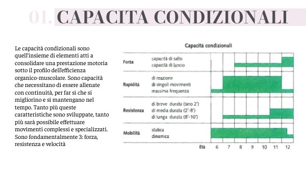 Le capacità condizionali sono quell’insieme di elementi atti a consolidare una prestazione motoria sotto il profilo dell’efficienza organico-muscolare. Sono capacità che necessitano di essere allenate con continuità, per far si che si migliorino e si mantengano nel tempo. Tanto più queste caratteristiche sono sviluppate, tanto più sarà possibile effettuare movimenti complessi e specializzati. Sono fondamentalmente 4: forza, resistenza, rapidità e mobilità.
