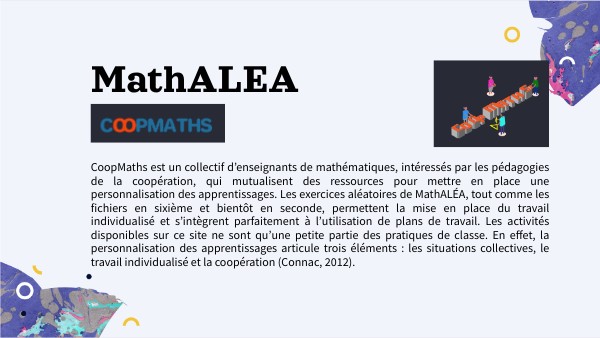 CoopMaths est un collectif d’enseignants de mathématiques, intéressés par les pédagogies de la coopération, qui mutualisent des ressources pour mettre en place une personnalisation des apprentissages. Les exercices aléatoires de MathALÉA, tout comme les fichiers en sixième et bientôt en seconde, permettent la mise en place du travail individualisé et s’intègrent parfaitement à l’utilisation de plans de travail. Les activités disponibles sur ce site ne sont qu’une petite partie des pratiques de classe. En effet, la personnalisation des apprentissages articule trois éléments : les situations collectives, le travail individualisé et la coopération (Connac, 2012).