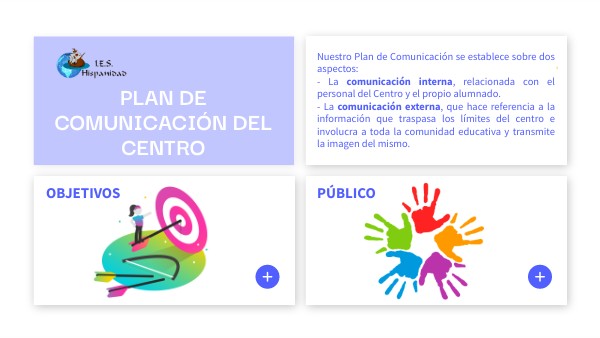 Nuestro Plan de Comunicación se establece sobre dos aspectos:- La comunicación interna, relacionada con el personal del Centro y el propio alumnado.- La comunicación externa, que hace referencia a la información que traspasa los límites del centro e involucra a toda la comunidad educativa y transmite la imagen del mismo.