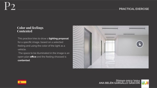 This practice tries to draw a lighting proposal for a specific image, based on a selected feeling and using the color of the light as a vehicle. The space to be illuminated in the image is an open-plan office and the feeling choosed is contented .