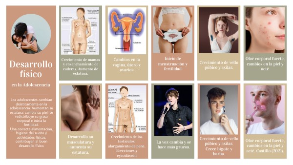 Los adolescentes cambian drásticamente en la adolescencia. Aumentan su estatura, cambia su piel, se redistribuye su grasa corporal e inicia la fertilidad.Una correcta alimentación, higiene del sueño y actividades físicas, contribuyen al buen desarrollo físico.