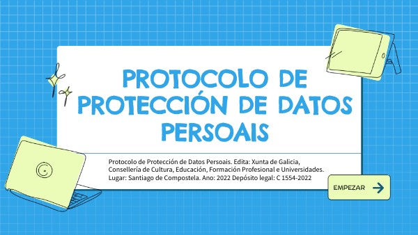 Protocolo de Protección de Datos Persoais. Edita: Xunta de Galicia, Consellería de Cultura, Educación, Formación Profesional e Universidades. Lugar: Santiago de Compostela. Ano: 2022 Depósito legal: C 1554-2022