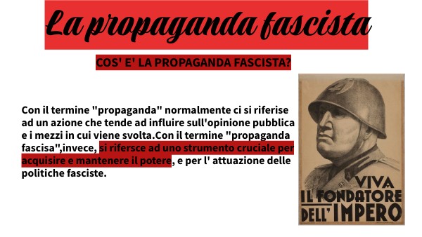 Con il termine "propaganda" normalmente ci si riferise ad un azione che tende ad influire sull'opinione pubblica e i mezzi in cui viene svolta.Con il termine "propaganda fascisa",invece, si rifersce ad uno strumento cruciale per acquisire e mantenere il potere, e per l' attuazione delle politiche fasciste.