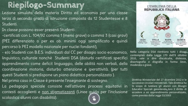 Lezione simulata della materia Diritto ed economia per una classe terza di secondo grado di istruzione composta da 12 Studentesse e 8 Studenti. In classe possono esser presenti Studenti : -certificati con L. 104/92 comma 1 (meno grave) o comma 3 (casi gravi) (PEI differenziato o per ex ob. minimi oggi semplificato e quindi percorso b PEI modello nazionale per nuclei fondanti), - e/o Studenti con B.E.S. individuati dal CC per disagio socio economico, linguistico, culturale nonchè Studenti DSA (disturbi certificati specifici apprendimento come deficit linguaggio, delle abilità non verbali, della coordinazione motoria, disturbo attenzione e iperattività. (per tutti questi Studenti si predispone un piano didattico personalizzato ). Nel primo caso in Classe è presente l'insegnante di sostegno. La pedagogia speciale consiste nell'attivare processi equitativi in contesti accoglienti e non stigmatizzanti (Linee guida per l'inclusione scolastica alunni con disabilità).