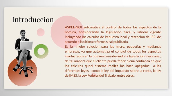 ASPEL-NOI automatiza el control de todos los aspectos de la nomina, considerando la legislacion fiscal y laboral vigente incluyendo los calculos de impuesto local y retencion de ISR, de acuerdo a la ultima reforma sical publicada.Es la mejor solucion para las micro, pequeñas y medianas empresas, ya que automatiza el control de todos los aspectos involucrados en la nomina considerando la legislacion mexicana , de tal manera que el cliente pueda tener plena confianza en que los calculos queel sistema realiza los hace apegados a las diferentes leyes , como la ley del impuesto sobre la renta, la ley de IMSS, la Ley Federal del Trabajo, entre otros.