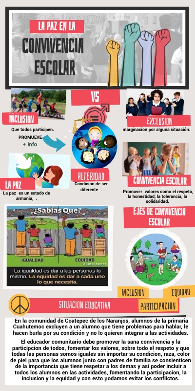 En la comunidad de Coatepec de los Naranjos, alumnos de la primaria Cuahutemoc excluyen a un alumno que tiene problemas para hablar, le hacen burla por su condición y no lo quieren integrar a las actividades. El educador comunitario debe promover la sana convivencia y la participcion de todos, fomentar los valores, sobre todo el respeto y que todas las personas somos iguales sin importar su condicion, raza, color de piel para que los alumnos junto con padres de familia se consienticen de la importancia que tiene respetar a los demas y asi poder incluir a todos los alumnos en las actividades, fomentando la participacion, la inclusion y la equidad y con esto podamos evitar los conflictos.