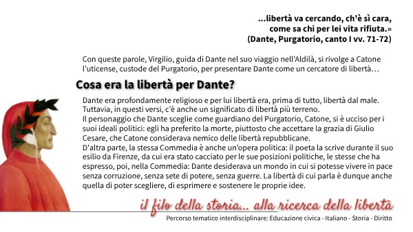 Dante era profondamente religioso e per lui libertà era, prima di tutto, libertà dal male. Tuttavia, in questi versi, c'è anche un significato di libertà più terreno. Il personaggio che Dante sceglie come guardiano del Purgatorio, Catone, si è ucciso per i suoi ideali politici: egli ha preferito la morte, piuttosto che accettare la grazia di Giulio Cesare, che Catone considerava nemico delle libertà repubblicane. D'altra parte, la stessa Commedia è anche un’opera politica: il poeta la scrive durante il suo esilio da Firenze, da cui era stato cacciato per le sue posizioni politiche, le stesse che ha espresso, poi, nella Commedia: Dante desiderava un mondo in cui si potesse vivere in pace senza corruzione, senza sete di potere, senza guerre. La libertà di cui parla è dunque anche quella di poter scegliere, di esprimere e sostenere le proprie idee.
