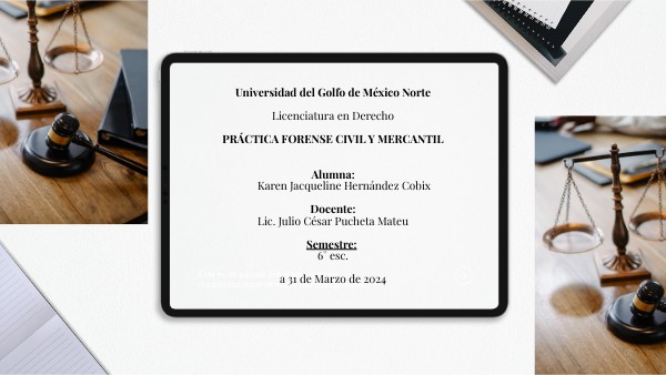 Universidad del Golfo de México Norte Licenciatura en Derecho PRÁCTICA FORENSE CIVIL Y MERCANTIL Alumna:Karen Jacqueline Hernández Cobix Docente:Lic. Julio César Pucheta Mateu Semestre: 6° esc. a 31 de Marzo de 2024