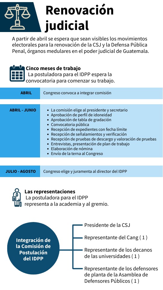 A partir de abril se espera que sean visibles los movimientos electorales para la renovación de la CSJ y la Defensa Pública Penal, órganos medulares en el poder judicial de Guatemala.