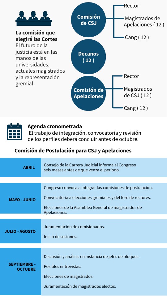 Congreso convoca a integrar las comisiones de postulación. Convocatoria a elecciones gremiales y del foro de rectores. Elecciones de la Asamblea General de magistrados de Apelaciones.