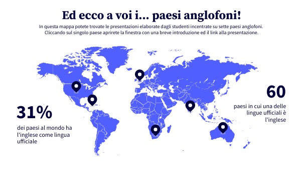 In questa mappa potete trovate le presentazioni elaborate dagli studenti incentrate su sette paesi anglofoni. Cliccando sul singolo paese aprirete la finestra con una breve introduzione ed il link alla presentazione.