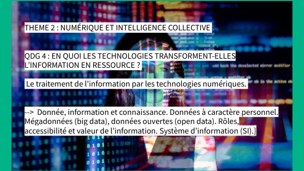 THEME 2 : NUMÉRIQUE ET INTELLIGENCE COLLECTIVE QDG 4 : EN QUOI LES TECHNOLOGIES TRANSFORMENT-ELLES L’INFORMATION EN RESSOURCE ? Le traitement de l'information par les technologies numériques. --> Donnée, information et connaissance. Données à caractère personnel. Mégadonnées (big data), données ouvertes (open data). Rôles, accessibilité et valeur de l’information. Système d’information (SI).]
