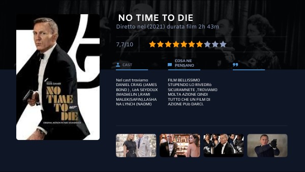Nel cast troviamo DANIEL CRAIG (JAMES BOND ) , LèA SEYDOUX (MADèELIN ),RAMI MALEK(SAFIN),LASHANA LYNCH (NAOMI)