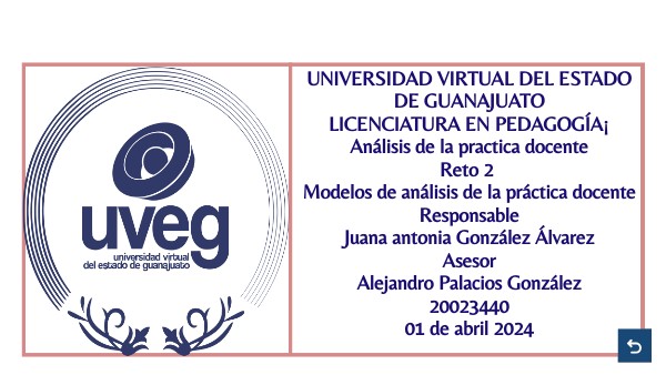 UNIVERSIDAD VIRTUAL DEL ESTADO DE GUANAJUATO LICENCIATURA EN PEDAGOGÍA¡ Análisis de la practica docente Reto 2 Modelos de análisis de la práctica docente Responsable Juana antonia González Álvarez Asesor Alejandro Palacios González 20023440 01 de abril 2024