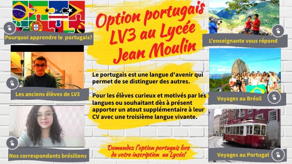 Le portugais est une langue d'avenir qui permet de se distinguer des autres. Pour les élèves curieux et motivés par les langues ou souhaitant dès à présent apporter un atout supplémentaire à leur CV avec une troisième langue vivante.
