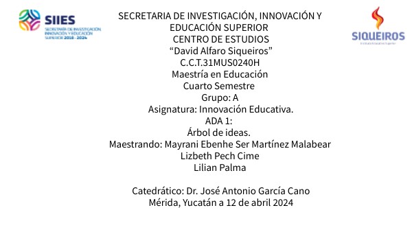 SECRETARIA DE INVESTIGACIÓN, INNOVACIÓN Y EDUCACIÓN SUPERIOR CENTRO DE ESTUDIOS “David Alfaro Siqueiros” C.C.T.31MUS0240H Maestría en Educación Cuarto Semestre Grupo: A Asignatura: Innovación Educativa. ADA 1: Árbol de ideas. Maestrando: Mayrani Ebenhe Ser Martínez Malabear Lizbeth Pech Cime Lilian Palma Catedrático: Dr. José Antonio García Cano Mérida, Yucatán a 12 de abril 2024